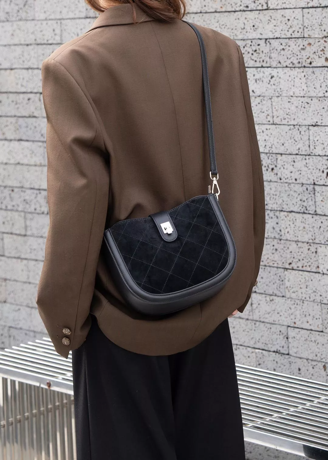 磨砂牛皮菱格半圓包-黑色